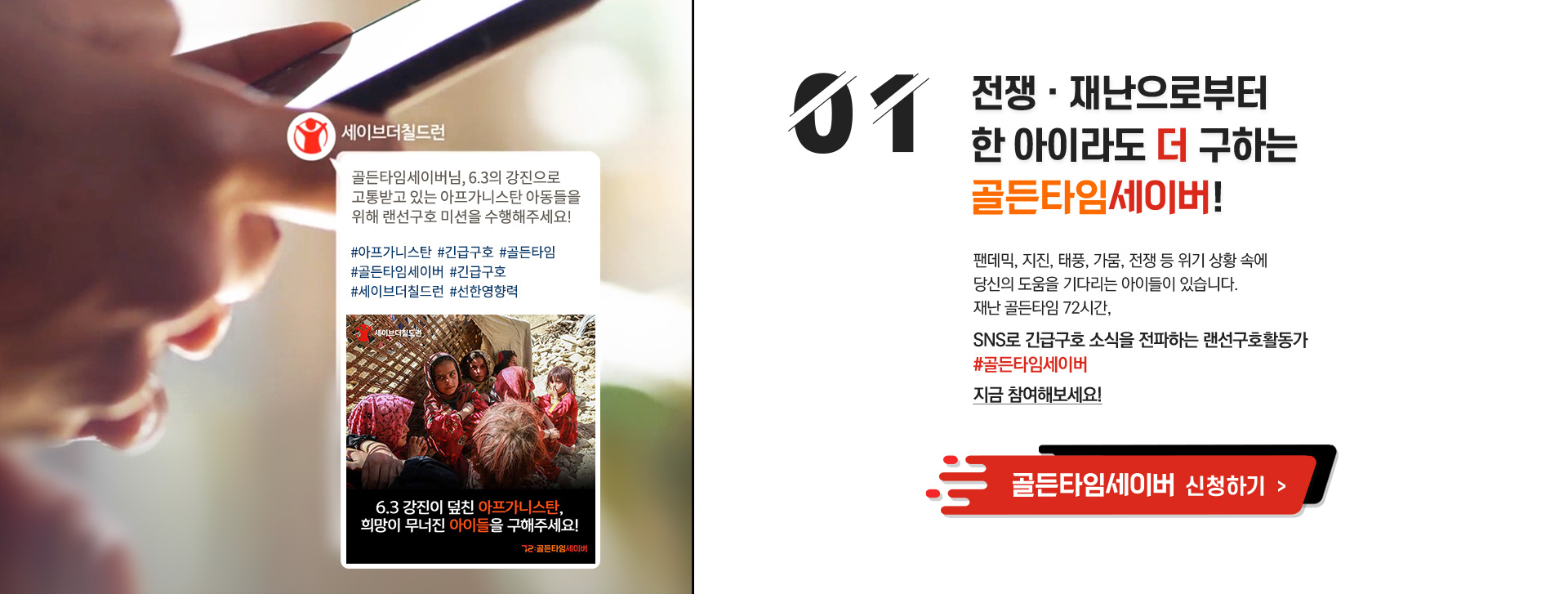 팬데믹, 지진, 태풍, 가뭄, 전쟁 등 위기 상황 속에 당신의 도움을 기다리는 아이들이 있습니다. 재난 골든타임 72시간, SNS로 긴급구호 소식을 전파하는 랜선구호활동가 #골든타임세이버 지금 참여해 보세요!