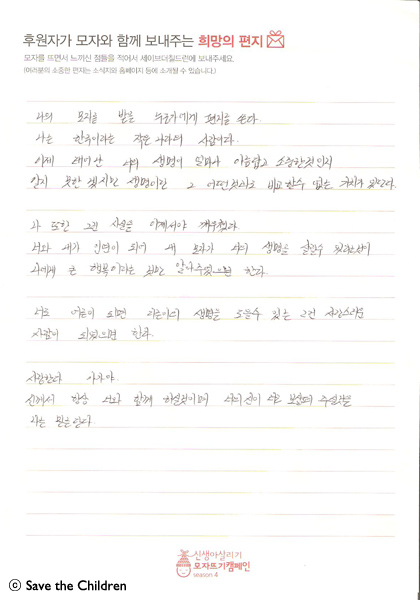 나의 모자를 받을 누군가에게 편지를 쓴다. 이제 태어난 너의 생명이 너와 내가 인연이 되어 너도 어른이 되면 다른 이의 생명을 도울 수 있는 사랑한다 아가야.