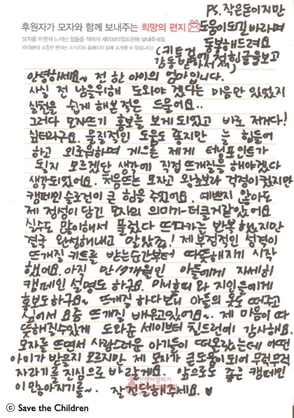 <신생아 살리기 모자뜨기 캠페인 시즌4>는 2011년에도 계속됩니다. 오늘은 시즌 4 참여하신 모자 후원자님께서 보내 주신 따뜻한 사연입니다.