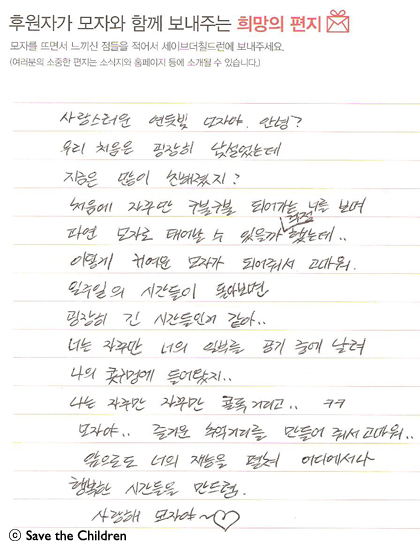 <신생아 살리기 모자뜨기 캠페인 시즌4> 기간이 연장되어 3월 31일까지 실시됩니다. 오늘은 시즌 4 참여하신 모자 후원자님께서 보내 주신 따뜻한 사연입니다.
