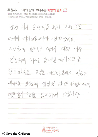 <신생아 살리기 모자뜨기 캠페인 시즌4> 기간이 연장되어 3월 31일까지 실시됩니다. 오늘은 시즌 4 참여하신 모자 후원자님께서 보내 주신 따뜻한 사연입니다.