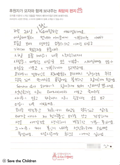 <신생아 살리기 모자뜨기 캠페인 시즌4> 기간이 연장되어 3월 31일까지 실시됩니다. 오늘은 시즌 4 참여하신 모자 후원자님께서 보내 주신 따뜻한 사연입니다.