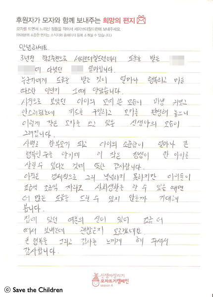 3년 전 학교추천으로 세이브더칠드런에서 도움을 받은 OOO 엄마입니다.