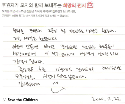 <신생아 살리기 모자뜨기 캠페인 시즌4> 기간이 연장되어 3월 31일까지 실시됩니다. 오늘은 시즌 4 참여하신 모자 후원자님께서 보내 주신 따뜻한 사연입니다.