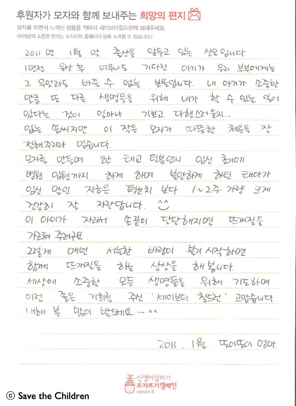 <신생아 살리기 모자뜨기 캠페인 시즌4> 기간이 연장되어 3월 31일까지 실시됩니다. 오늘은 시즌 4 참여하신 모자 후원자님께서 보내 주신 따뜻한 사연입니다.