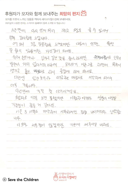<신생아 살리기 모자뜨기 캠페인 시즌4> 기간이 연장되어 3월 31일까지 실시됩니다. 오늘은 시즌 4 참여하신 모자 후원자님께서 보내 주신 따뜻한 사연입니다.