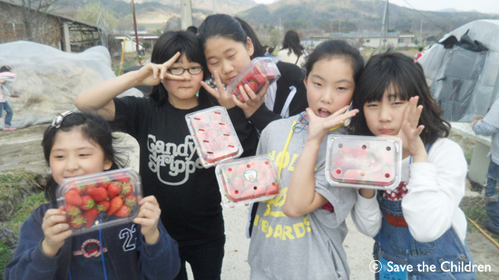 사진/ 자신이 직접 딴 딸기를 들고 즐거워 하고 있는 아동들