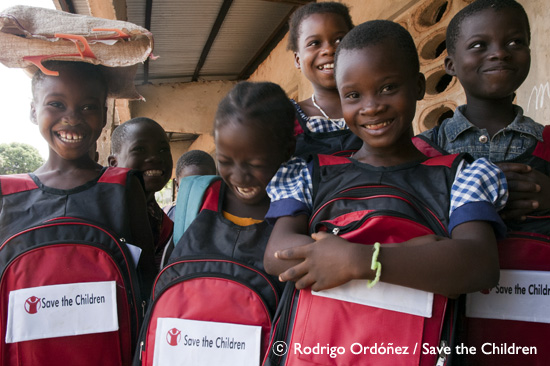 사진/ 책가방과 펜, 연필, 연필깎이, 공책, 자, 콤파스 2개와 휴대용 칠판 등의 학교복귀키트를 받은 아동들