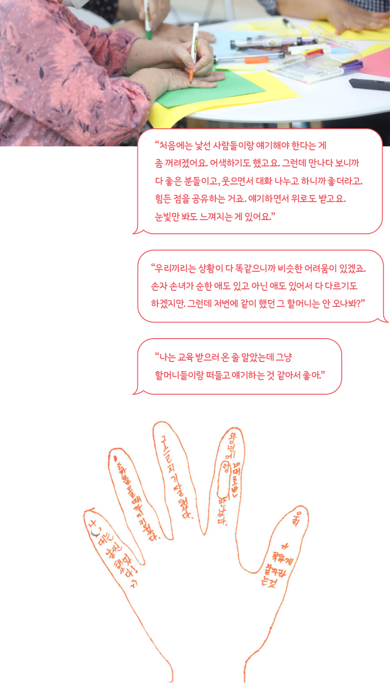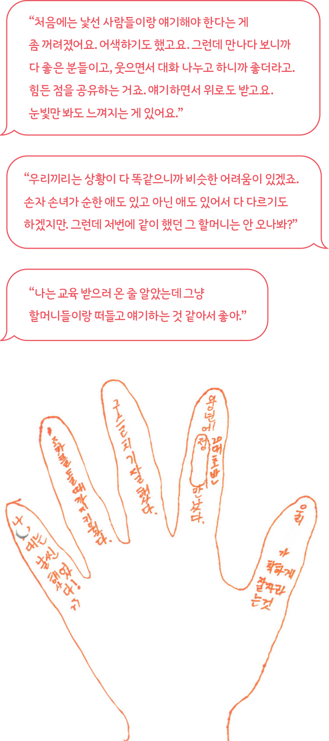왜 아이를 때리지 말아야 하는지, 빠르게 변하는 세상에서 아이들이 멀게만 느껴질 때 어떻게 해야 하는지 함께 이야기하다 보면 네 번의 만남이 금방 지나갑니다. 이렇게 모인 할머니, 할아버지는 자조모임으로 계속 만나면서 배운 내용을 다시 돌아보고, 서로에게 힘이 되어주기도 합니다. 아이 양육에 관해 어려울 때 언제든지 담당 복지사에게 도움을 청할 수도 있습니다.