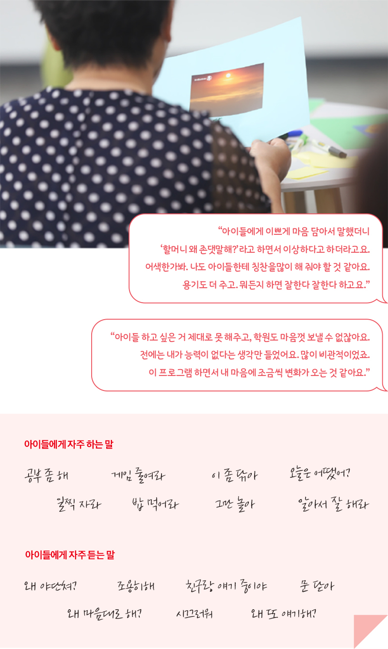 아이를 키우는 할머니, 할아버지에게 처음 조손도손을 소개할 때 교육 프로그램이라고 말하지 않습니다.