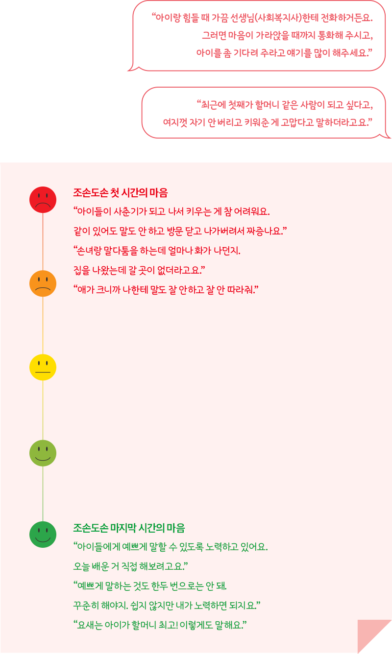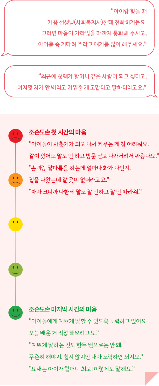 처음 조손도손을 시작할 때의 마음과 마친 후의 마음은 분명히 달라졌습니다. 자녀를 키우고 또다시 아이를 키워야 하는 할머니, 할아버지에게 다시 한번 잘 해보고 싶은 의지가 생겼습니다. 마음의 변화는 힘이 커서 금세 아이들에게도 나타난다고 합니다. 할머니, 할아버지 마음의 주름이 펴지는 시간, 아이들의 얼굴도 활짝 펴집니다.