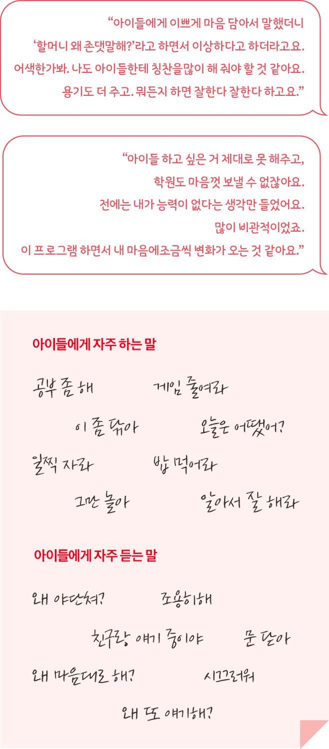 평소 가정에서 할머니, 할아버지는 아이들에게 어떤 말을 들을까요? 그리고 아이들에게 어떤 말을 할까요? 마음은 그게 아닌데 상처를 주는 말들이 오고 갈 때가 많습니다. 아이들과의 의사소통을 돌아보고, 아이를 사랑하는 마음을 말그릇에 담아보는 연습을 합니다. 아이들에게 절대 하지 말아야 할 말과, 더 많이 해줘야 하는 말이 무엇인지 이야기하고, 다짐도 해봅니다.