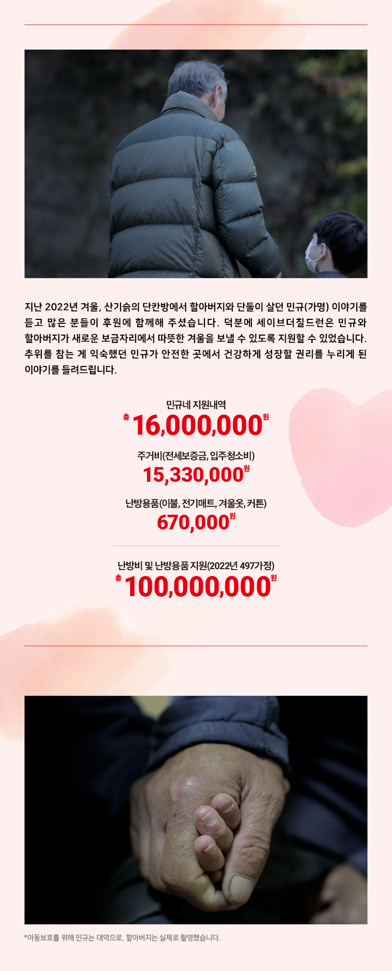 얼굴조차 모르는 아빠와 정신질환으로 민규를 키울 수 없었던 엄마 대신 외할머니와 외할아버지는 민규가 태어났을 때부터 자식처럼 돌봐왔습니다. 3년 전, 외할머니가 세상을 떠난 후 할아버지 혼자서 민규를 키우는 일은 쉽지 않았습니다. 겨울이면 민규와 할아버지는 보일러가 들어오지 않는 낡은 집에서 작은 난로로 추위를 나야 했습니다. 그나마 적은 돈이라도 벌 수 있었던 고추 농사까지 망했던 해. 민규의 겨울옷을 사기도 버거운데, 집주인의 사정으로 당장 집까지 비워야 했습니다.