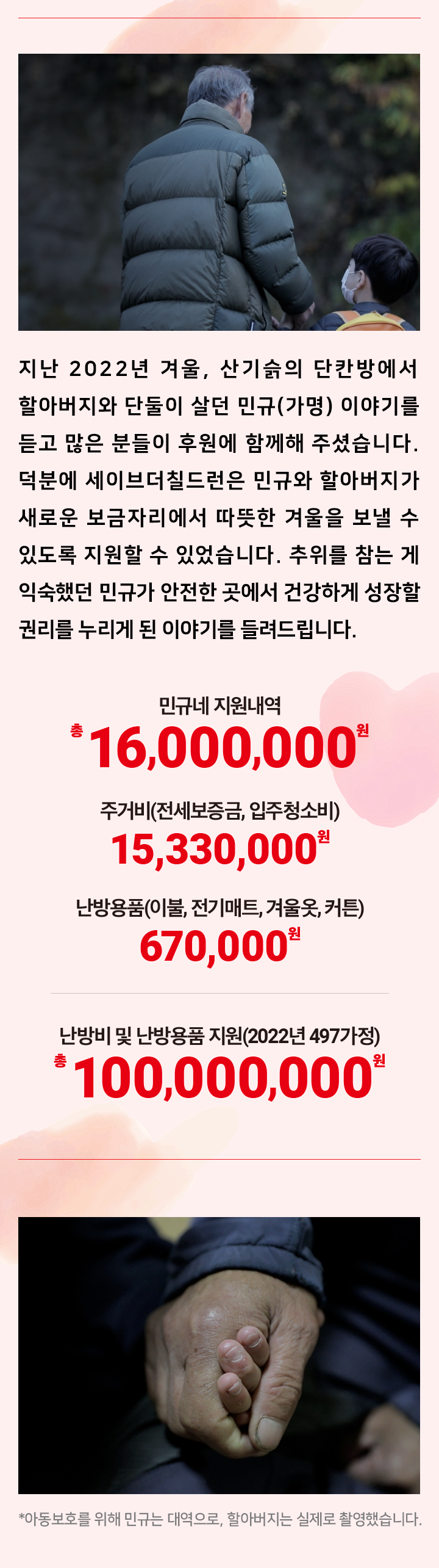 민규와 할아버지가 새로 이사한 집에서 맞는 이번 겨울은 작년과는 또 다른 시간으로 기억되지 않을까요? 민규뿐만 아니라, 수많은 저소득가정 아이들에게 겨울이 추위를 견디는 시간이 아닌 누군가의 따뜻한 마음을 확인하는 시간이 되면 좋겠습니다.