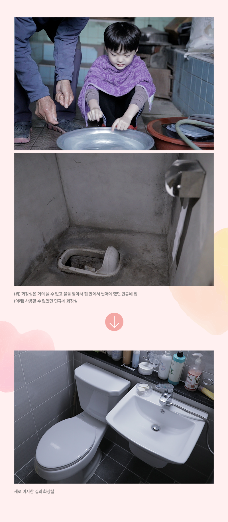 세이브더칠드런은 민규네 가정에 전세보증금과 이사비용, 난방용품을 지원했습니다. 할아버지는 무엇보다 난방이 잘 되어서 민규 목욕시키기가 쉽다고 합니다. “예전 집은 보일러가 안 되고 난방장치도 없고 그래서 추웠죠. 이사한 집에 도배랑 장판도 다 해주고, 침구도 해주고, 집수리도 해주고, 옷장도 사주고. 많이 받았어요. 특히 난방이 잘 되니까 편해요.”
