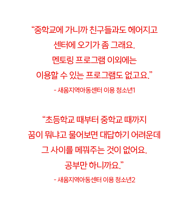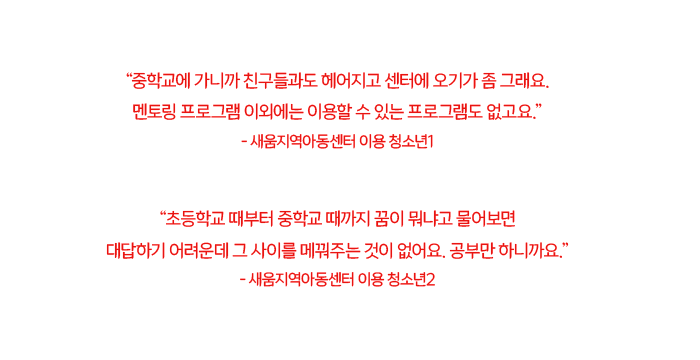 전주에 위치한 세이브더칠드런 서부지역본부의 새움지역아동센터는 방과 후나 방학 중에 학교나 양육자의 돌봄 공백을 줄여주는 공간이었습니다. 이곳에서 아이들은 교육과 놀이 프로그램에 참여하며 안전하게 머물수 있었습니다. 센터에 등록한 아동 중 취약계층 아동의 비율이 높고, 초·중·고 인근에 있어 지역 내 많은 아동이 머무는 공간이기도 했습니다. 하지만 초등학교를 졸업하고 청소년이 된 학생들에 방문이 줄어들고, 한편으로는 돌봄, 교육, 정서적 지지의 부족, 사회적 양극화 문제로 인한 위기청소년이 증가하는 등 청소년을 위한 계획이 필요했습니다.