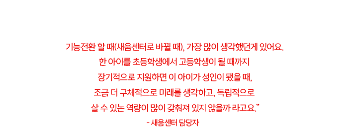 이에 세이브더칠드런은 새움지역아동센터를 아동·청소년 지원기관으로 바꾸기 위한 준비를 2021년부터 시작했습니다.
