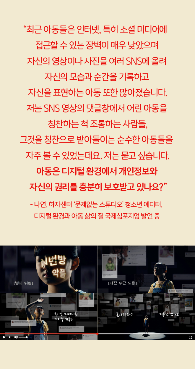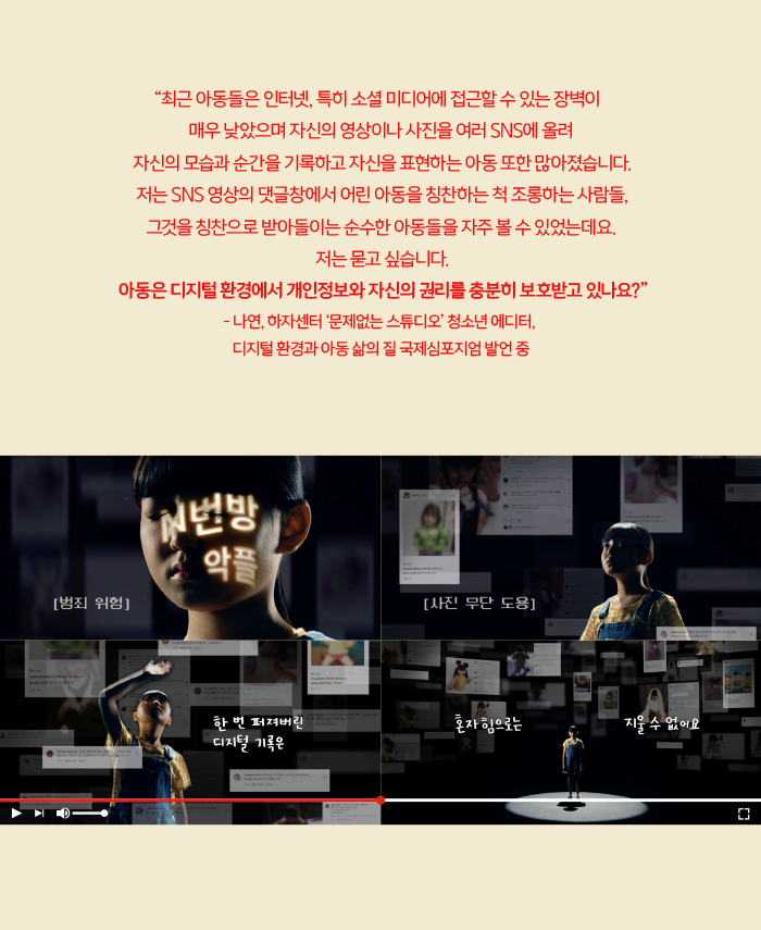 2022년 과학기술정보통신부에 따르면 10세~19세 청소년의 99%가 인터넷을 사용했습니다. 청소년만이 아닙니다. 3세 이상 9세 이하 아동 역시 10명 중 9명이 온라인 세상에 접속합니다. 태어날 때부터 스마트폰이나 태블릿 등 디지털 기기를 일상적으로 접하는 아동에게는 어쩌면 당연한 일입니다. 아동은 온라인 세상에서 공부하거나 필요한 정보를 찾고, 게임을 하면서 친구를 사귀며, 사람들과 소통합니다. 이 과정에서 아동은 ‘디지털 발자국’이라고 일컫는 다양한 기록을 남깁니다. 아동이 남기는 기록만 있지 않습니다. 아동의 보호자나 주변 사람들이 올리는 글이나 사진, 영상을 통해서도 아동의 다양한 삶의 흔적이 디지털 발자국으로 ‘박제’됩니다.