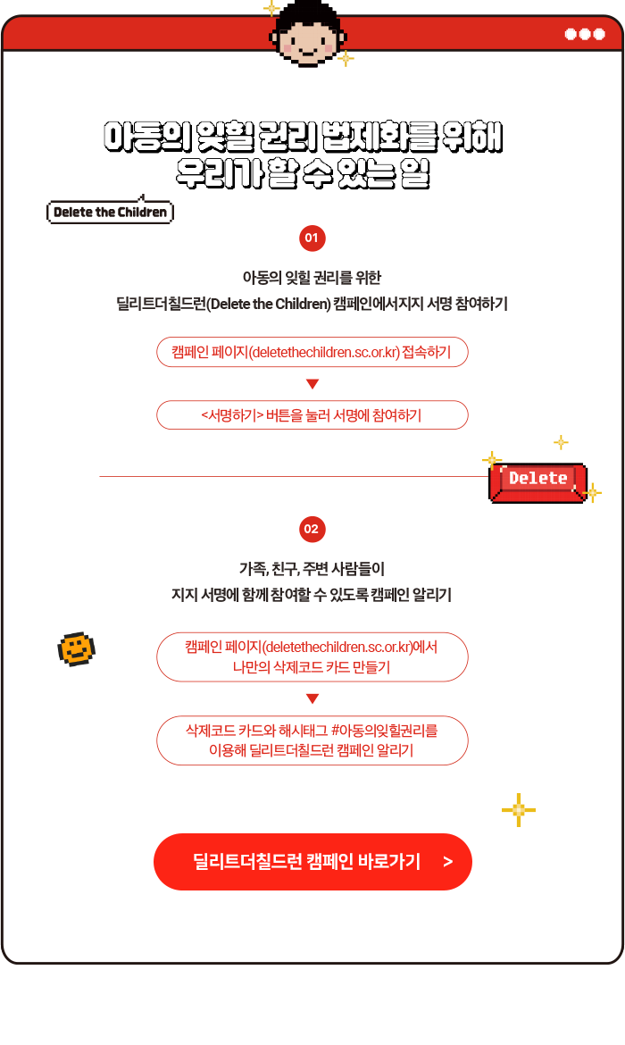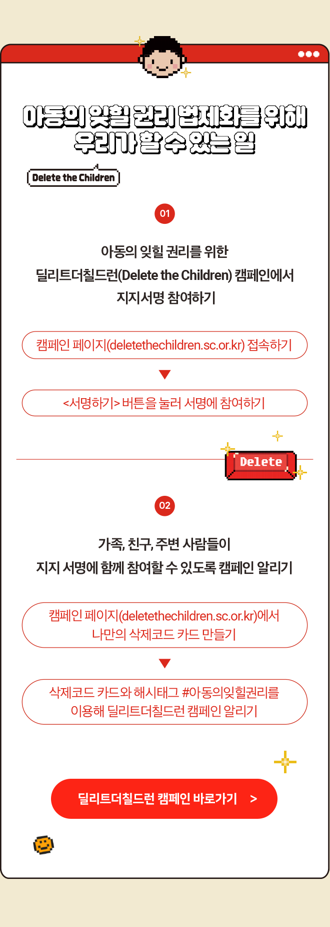 세이브더칠드런은 아동의 잊힐 권리를 위한 제도를 국가가 마련하도록 요구하며 딜리트더칠드런(Delete the Children) 캠페인을 통해 시민들의 지지 서명을 받고 있습니다. 지지 서명은 정부와 국회에 전달하여 아동의 잊힐 권리 제도화를 앞당기는 데 소중하게 사용될 예정입니다. 아동이 디지털 환경에서도 안전하게 자신의 권리를 누릴 수 있도록 지금 바로 함께 해주세요.