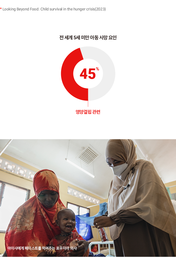세이브더칠드런의 *<음식 그 너머를 바라보다:기아위기 속의 아동 생존> 보고서에 따르면 전 세계 5세 미만 아동 사망 요인 중 45%가 영양결핍과 관련 있으며 영양실조에 걸리지 않은 아동에 비해 질병으로 사망할 확률이 11배 더 높게 나타났습니다. 하루라도 더 빨리 영양 상태를 확인하고 치료하는 일은 더 많은 아동을 살리는 일입니다.