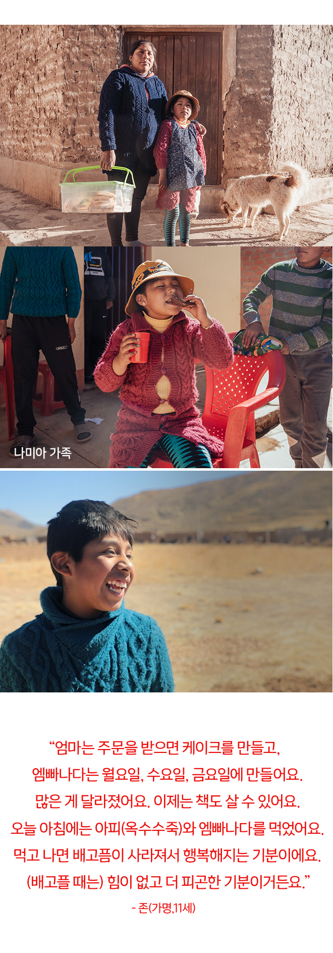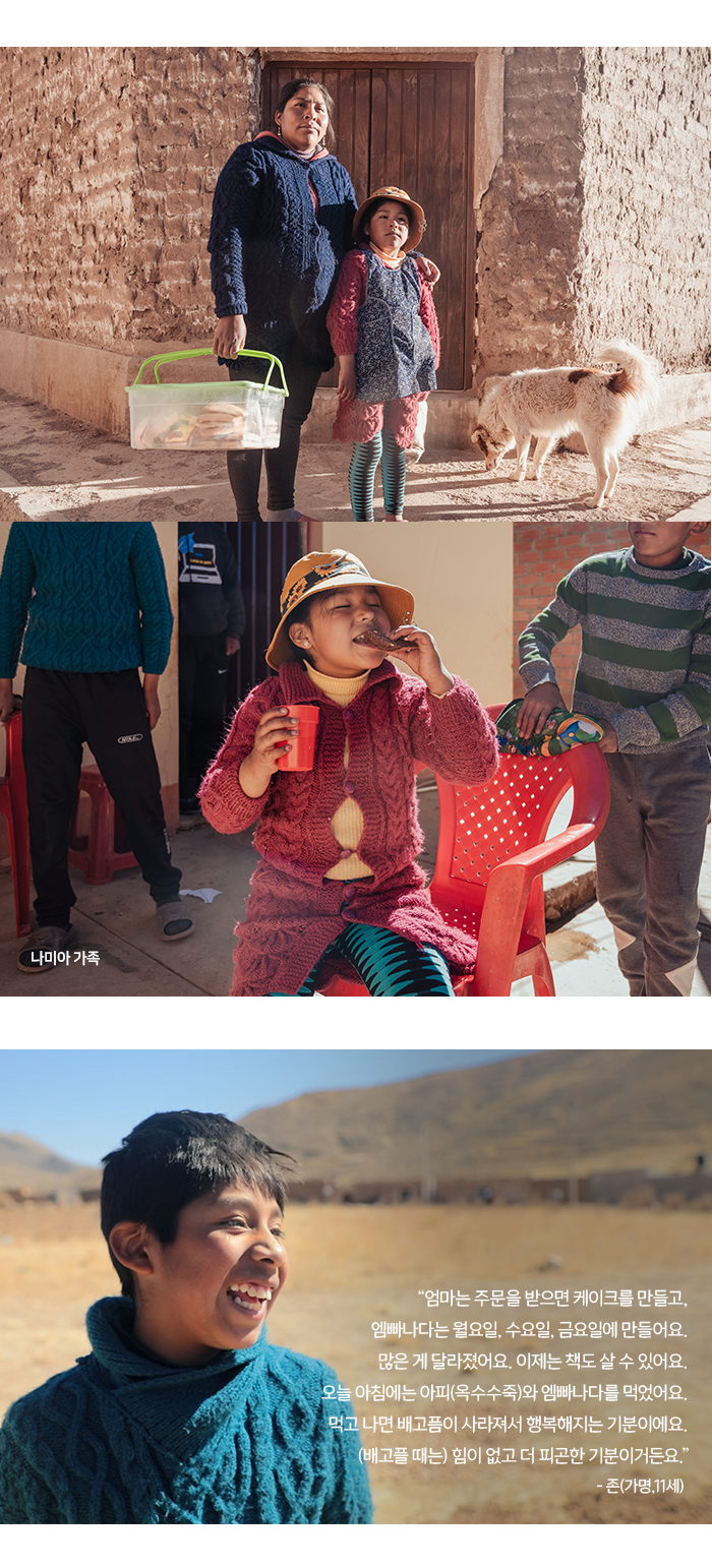 볼리비아의 나미아 가족도 식량 위기로 아이들의 미래가 막막했었습니다. 나미아 가족은 감자 재배와 나미아 남편이 벽돌공으로 일하며 생계를 이어왔습니다. 기후변화로 가뭄과 서리가 심해지자 감자 수확량이 줄고 그만큼 생계가 어려워졌습니다. 나미아는 아이들이 굶거나, 학교 준비물을 사줄 수 없어 울기도 했습니다. 세이브더칠드런은 나미아에게 제빵 교육과 오븐을 지원했습니다. 나미아는 엠빠나다(남미의 주식과 같은 군만두의 일종)와 케이크를 판매하며 생계가 안정되고, 아이들은 매 끼니를 챙겨먹으며 학교를 다닐 수 있게 됐습니다.