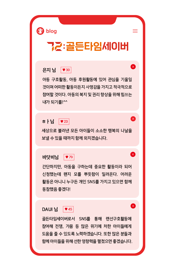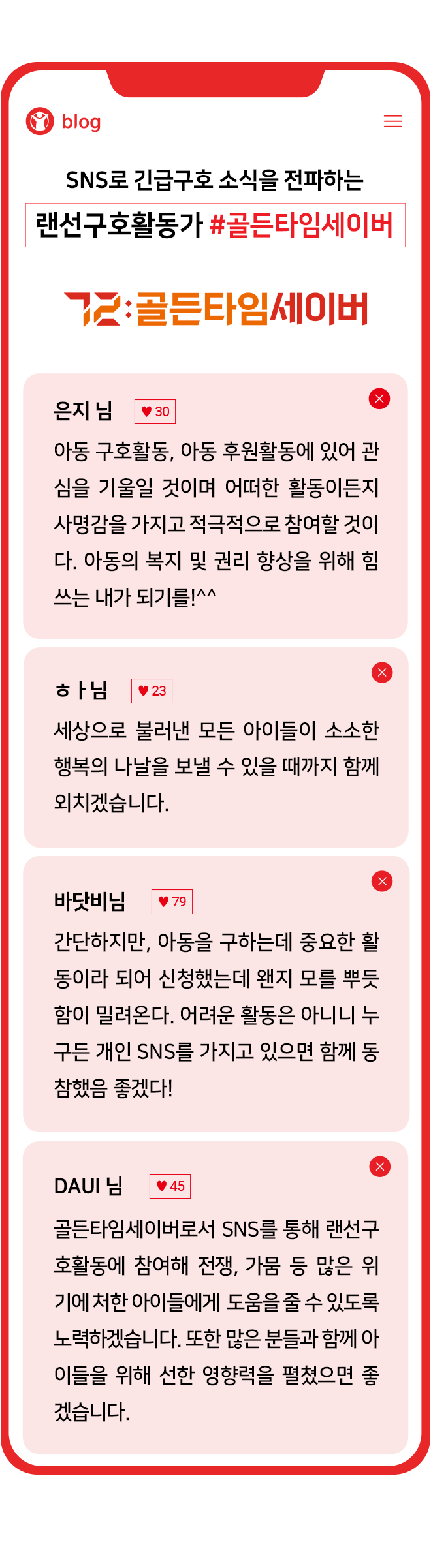 지진, 태풍, 가뭄, 전쟁 등 전 세계 아이들이 위험에 처하면 72시간 이내에 랜선구호를 시작하는 골든타임세이버! 작은 행동, 변화들이 모여 큰 움직임을 만드는 올해 골든타임세이버들의 목소리를 전합니다.