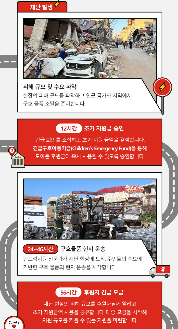 ❌ 골든 타임 72시간은 시간과의 사투. 재난이 발생하면 우선 구호 물품을 싣고 현장으로 향해야 생명을 구할 수 있습니다. 각국에서 후원금이 모이기를 기다린다면 골든 타임을 놓치게 되겠죠. 따라서 재난 발생 전부터 긴급구호아동기금(CEF)을 통해 미리 후원금을 모아두는 것이 무척 중요합니다. 시시각각 발생하는 재난에 대비하는 지구촌 비상금 적금이라고 볼 수 있겠네요.