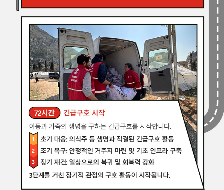 재난 발생 이후 긴급 구호 시작까지. 하루아침에 모든 걸 잃은 아동과 가족에게 1분 1초는 생명과 직결된 시간입니다. 72시간 골든 타임을 절대 지키기 위한 세이브더칠드런의 타임라인을 공개합니다.
