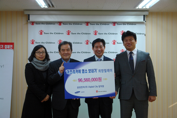 지난 12월 27일, 삼성전자㈜ Digital City 는 <아프리카에 염소보내기 희망릴레이 캠페인> 후원을 위해 96,560,000원 (염소 총 2,414마리)의 기금을 전달해주셨습니다. 이 기금은 삼성전자㈜ Digital City 임직원분들의 사내 인트라넷 팝업창 사랑의 클릭 참여신청하기 및 댓글 남기기를 통해 12월13일부터 18일까지, 총 6일간의 행사로 조성되었으며, 2010년 식량위기 긴급구호가 발령된 아프리카 니제르 진더지역에 가축지원을 통해 사상 최악의 식량부족 위기를 극복할 수 있도록 지원될 것입니다.