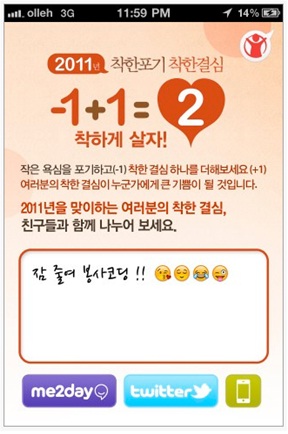 이번에 런칭한 어플리케이션을 통해 세이브더칠드런에서 진행하는 <2011 착한포기 착한결심 캠페인>을 더 쉽고 재미있게 실천할 수 있습니다. 마음만 먹고 실천하지 못했던 결심들을 트위터나 미투데이와 같은 SNS를 통해 지인들과 공유하여 공약할 수 있습니다