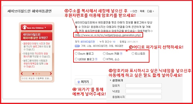 해외결연후원자님들께서 자신의 블로그, 카페, 홈페이지 등에 자신의 결연아동의 정보를 항상 가깝게 접할 수 있게 해드리기위한 위젯서비스를 런칭하여 알려드립니다.