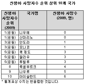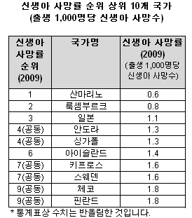 한국의 신생아 사망률은 1990년 1,000명 당 4명에서 2009년 2.2명으로 45% 감소해 프랑스(France), 에스토니아(Estonia), 몰타(Malta) 등과 함께 신생아 사망률 순위 공동 16위에 올랐다.