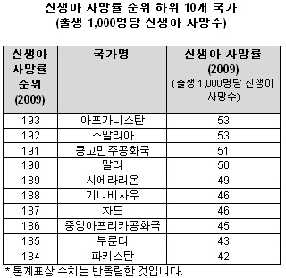 신생아 사망률이 가장 높은 국가는 2009년 1,000명당 53명의 신생아가 사망한 아프가니스탄(Afghanistan)으로 조사됐다. 최근 극심한 가뭄과 기근으로 긴급구호가 선포된 소말리아(Somalia) 역시 53명으로 높은 신생아 사망률을 보였다. 이밖에, 콩고민주공화국(Democratic Republic of Congo)이 51명, 말리(Mali)가 50명, 시에라리온(Sierra Leone)이 49명으로 중앙아시아와 아프리카 국가들이 하위권을 차지했다.