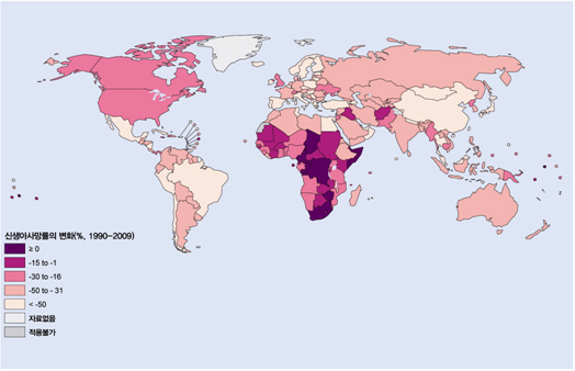 지도/ 신생아 사망률의 변화(1990년~2009년) <출처: 플로스 메디슨(PLos Medicine)지>