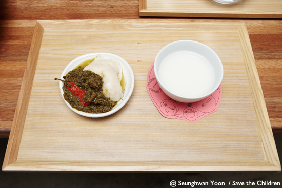 “오늘 아침으로는 인제라(injera: 기본적인 양념을 곁들여 먹는 납작한 빵)를 조금 먹었어요. 4명이 인제라 한 덩어리를 같이 먹어요. 점심 때도 똑같이 먹었어요. 이것 말고는 먹을 것이 없어요. 일 년에 한 번쯤 특별한 날에만 달걀이나 고기를 먹기도 해요. 먹을 것이 충분하지는 않지만 부모님은 뭐든 저를 먹이려고 하시지요. 학교에서도 배가 고플 때가 있어요. 저는 바로 저기 언덕 위에 있는 학교까지 걸어서 다녀요.”