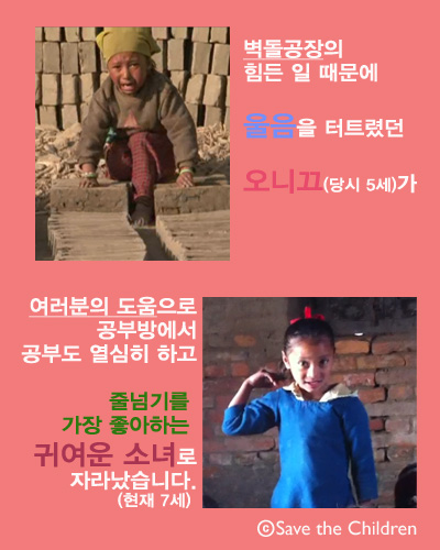 안녕하세요, 세이브더칠드런입니다.작년에 <SBS희망TV>를 통해서 방송되었던 벽돌공장의 소녀 '오니끄' 사연 기억하시나요?그 소녀가 여러분의 도움으로 어떻게 변화하였는지,후속 촬영본이 오는 5/2 모닝와이드를 통해 요약편이 방송될 예정입니다.(방송시간 8:10~8:20 예정)많은 분들이 안타까워했던 사연인 만큼,그 변화가 주는 감동을 함께 해주시길 바랍니다.