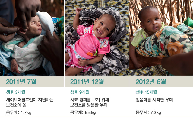 생후 3개월이던 우미가 세이브더칠드런이 지원하는 케냐 와지르(Wajir) 지역의 한 보건소에 왔습니다. 당시 우미는 몸무게가 1.7kg 밖에 되지 않을 정도로 심각한 영양실조 상태에 탈수와 폐렴 증상도 보이고 있었습니다. 우미는 닷새 째 구토를 해서 아무 것도 제대로 먹지 못한 상태였습니다. 우미의 어머니도 영양실조 상태이기는 마찬가지였습니다.