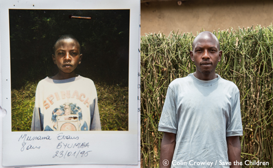 할머니 집에 갔다 대학살이 벌어져 집에 돌아가지 못하고 피난한 에반스 씨(당시 8세)도 비윰바의 고아원에서 세이브더칠드런의 도움을 받아 삼촌을 만날 수 있었다. 에반스 씨는 당시 찍은 사진을 보고 이 사진이 찍힌 후에야 부모님이 돌아가셨다는 사실을 알게 되었고 더욱 고통스러운 시간을 보냈다며 그 때의 힘들었던 기억을 떠올렸다. 하지만 그는 어린 시절 사진이 단 한 장도 남아 있지 않은데 세이브더칠드런이 이렇게 수십 년의 세월이 지난 후 나를 보기 위해 왔다는 사실에 큰 감동을 받았다고 말했다.