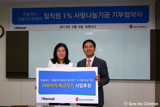 9월 6일, 한솔제지와 한솔아트원제지는 세이브더칠드런의 아프리카 여아 교육 사업에 후원하기로 하고 이날 협약을 체결했습니다. 임직원의 자발적인 참여로 모인 ‘1% 사랑나눔기금’을 통해 2016년까지 총 3억 원을 후원할 예정입니다. 이 후원금은 아프리카 지역에 학교 3곳을 건립하는데 쓰이게 되며, 2014년 시에라리온에 그 첫 번째 학교가 지어질 예정입니다.