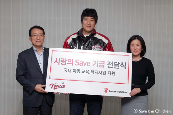 세이브더칠드런과 협약을 맺고 있는 LG트윈스는 12월 12일 LG스포츠 사무실에서 시즌 중 적립한 ‘사랑의 Save 기금’ 540만원을 전달했습니다. 이 기금은 LG트윈스가 올 시즌 봉중근과 정현욱 투수가 세이브(38세이브)와 홀드(16홀드)를 기록할 때마다 10만원씩 적립하여 조성되었습니다. 이날 행사에는 정현욱 선수가 참석했으며, 전달된 기금은 국내 아동교육 및 복지사업에 사용될 계획입니다.