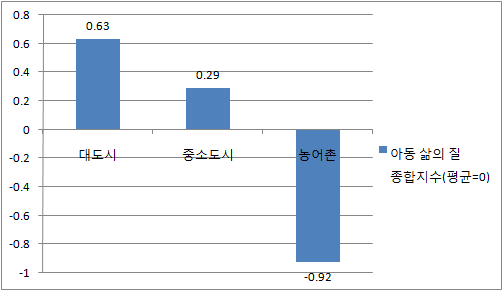 대도시에 비해 재정자립도와 복지예산이 낮은 지방 소도시일수록 아동의 삶의 질이떨어지는 것으로 조사됐다. 또 가정, 학교, 지역사회에서 안전하다고 느낄수록 아동의 주관적 행복감도 높아지는 것으로 나타났다.