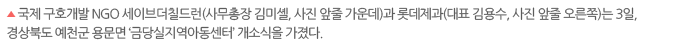 국제 구호개발 NGO 세이브더칠드런(사무총장 김미셸)과 롯데제과(대표 김용수)는 3일, 경상북도 예천군 용문면 ‘금당실지역아동센터’ 개소식을 가졌다.