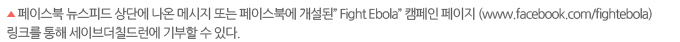 한국 페이스북 사용자들은 뉴스피드 상단에 나온 메시지 또는 페이스북에 개설된 “Fight Ebola” 캠페인 페이지(www.facebook.com/fightebola) 링크를 통해 세이브더칠드런에 기부할 수도 있다.
