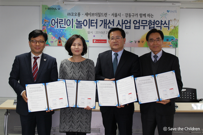 2월 1일, ㈜코오롱과 세이브더칠드런, 서울시, 강동구청은 ‘어린이놀이터 개선사업 업무 협약식’을 서울시청 무교청사에서 체결했습니다.