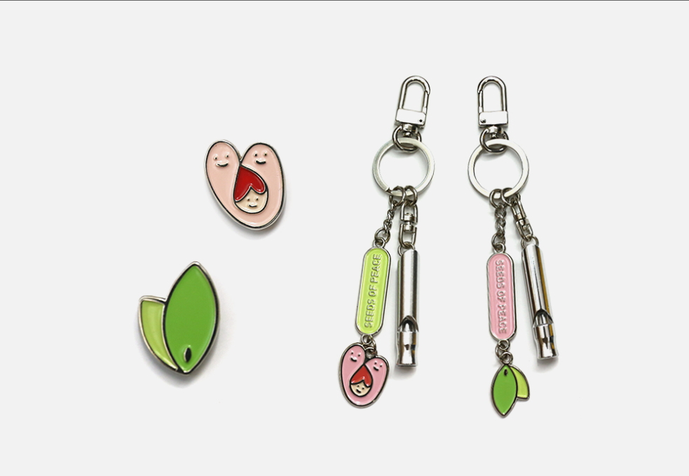 ‘평화의 씨앗’ 배지와 키링은 5월 31일부터 네이버 해피빈을 시작으로 6월 9일 마리몬드 홈페이지(www.marymond.com)에서 살 수 있다. 배지는 각 5천원, 키링은 각 1만2천5백원이다.