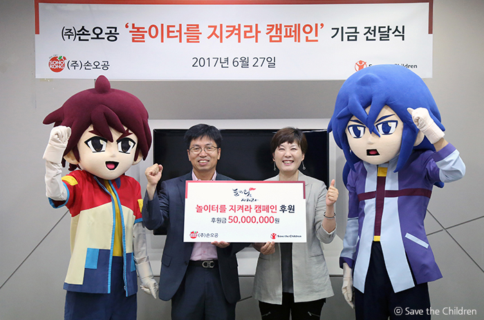 6월 27일, ㈜손오공은 세이브더칠드런의 ‘놀이터를 지켜라’ 캠페인에 후원금 5천만원을 후원했습니다. 후원금은 작년 12월부터 올해 5월까지 터닝메카드, 헬로카봇, 소피루비의 완구 판매 수익금 일부를 적립하여 조성됐습니다.