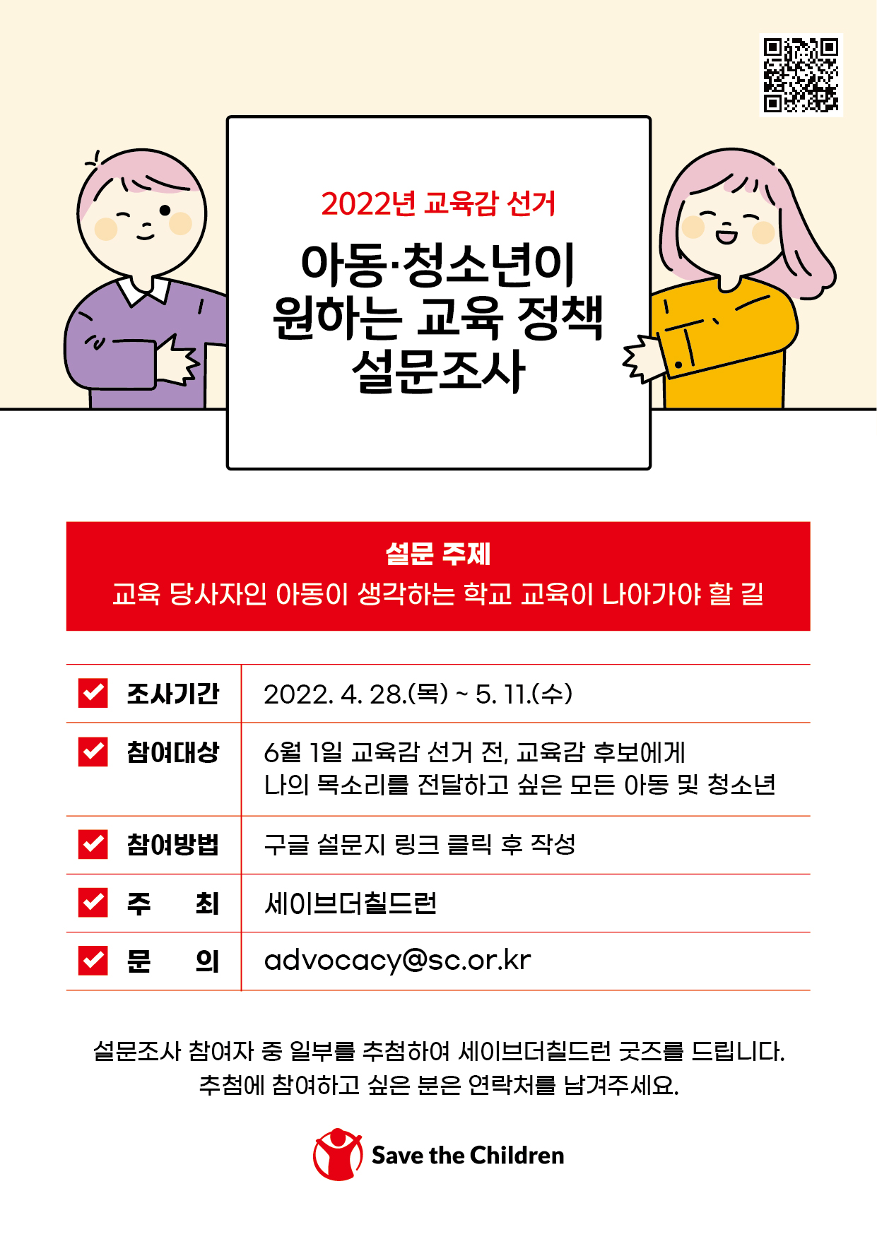 세이브더칠드런은 2022년 교육감 선거를 앞두고, 교육의 주인공인 아동·청소년의 의견을 모으고 있습니다. 설문조사에 참여한 분들의 응답 결과는
