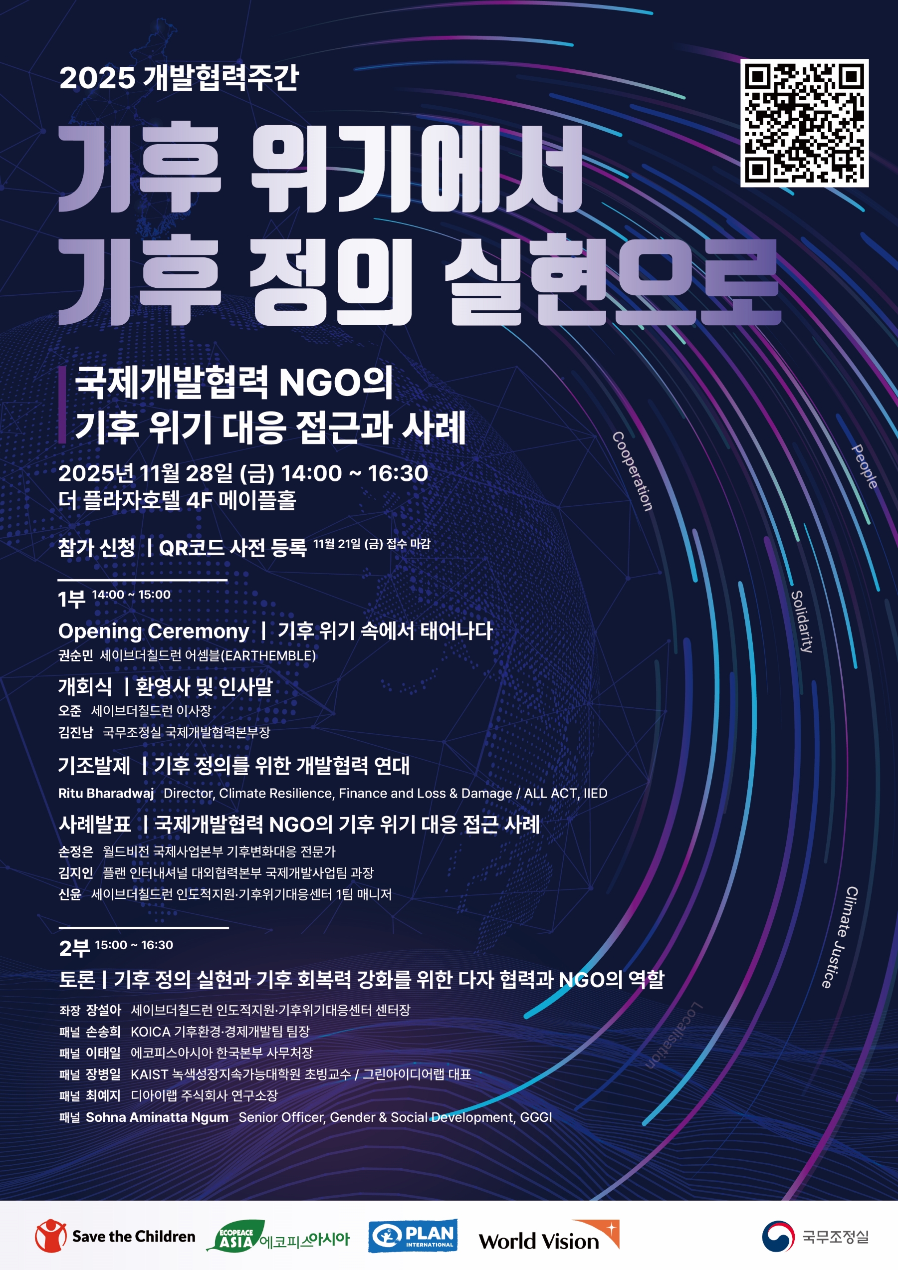 세이브더칠드런은 국무조정실이 주최하는 2025 개발협력주간을 맞아 에코피스아시아, 월드비전, 플랜 인터내셔널과 공동으로 「기후 위기에서 기후 정의 실현으로」 포럼을 개최합니다.
