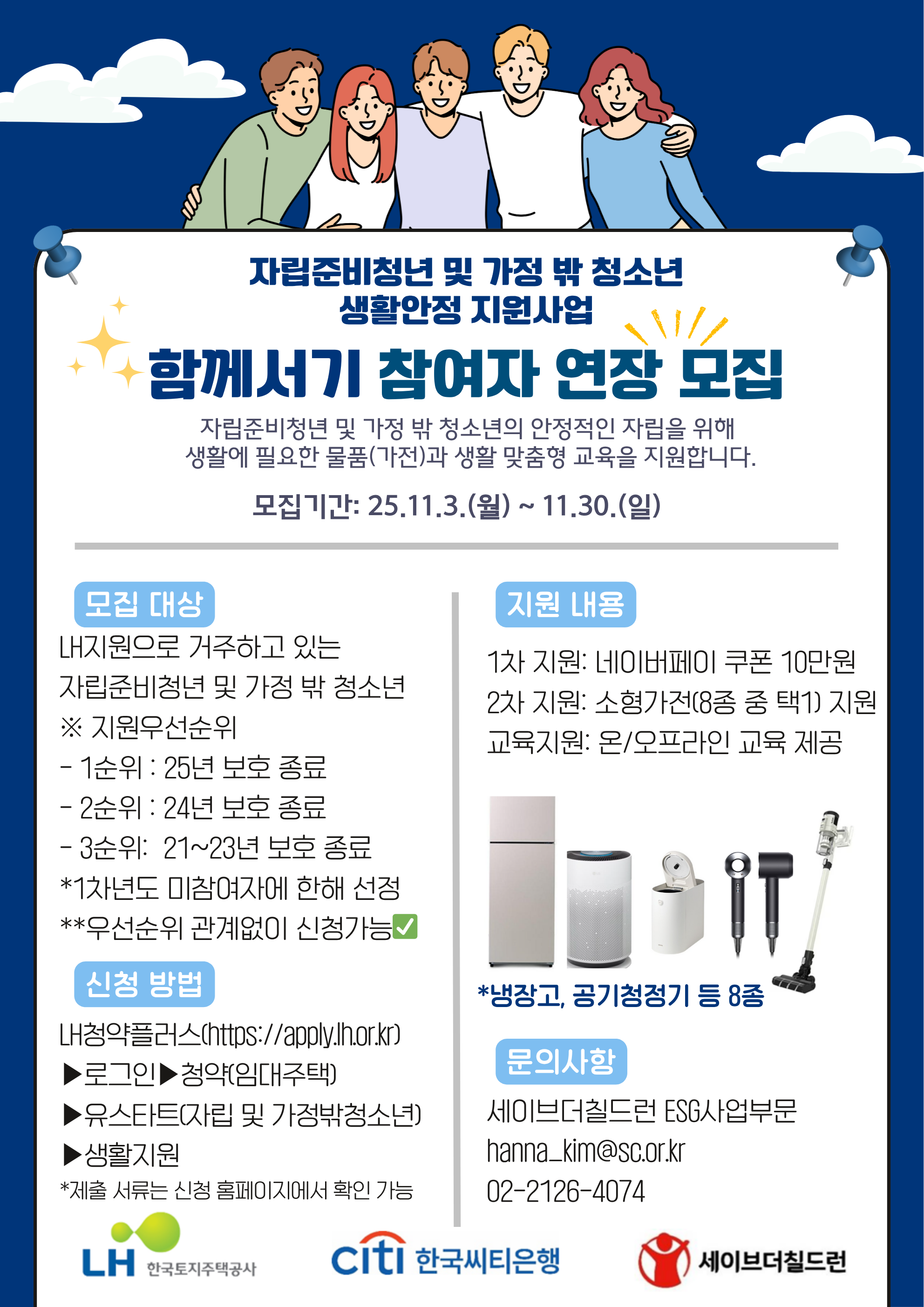 붙임 2. [한국씨티은행X세이브더칠드런] 자립준비청년 및 가정 밖 청소년 생활안정 지원 사업 모집 연장 홍보 포스터.png
