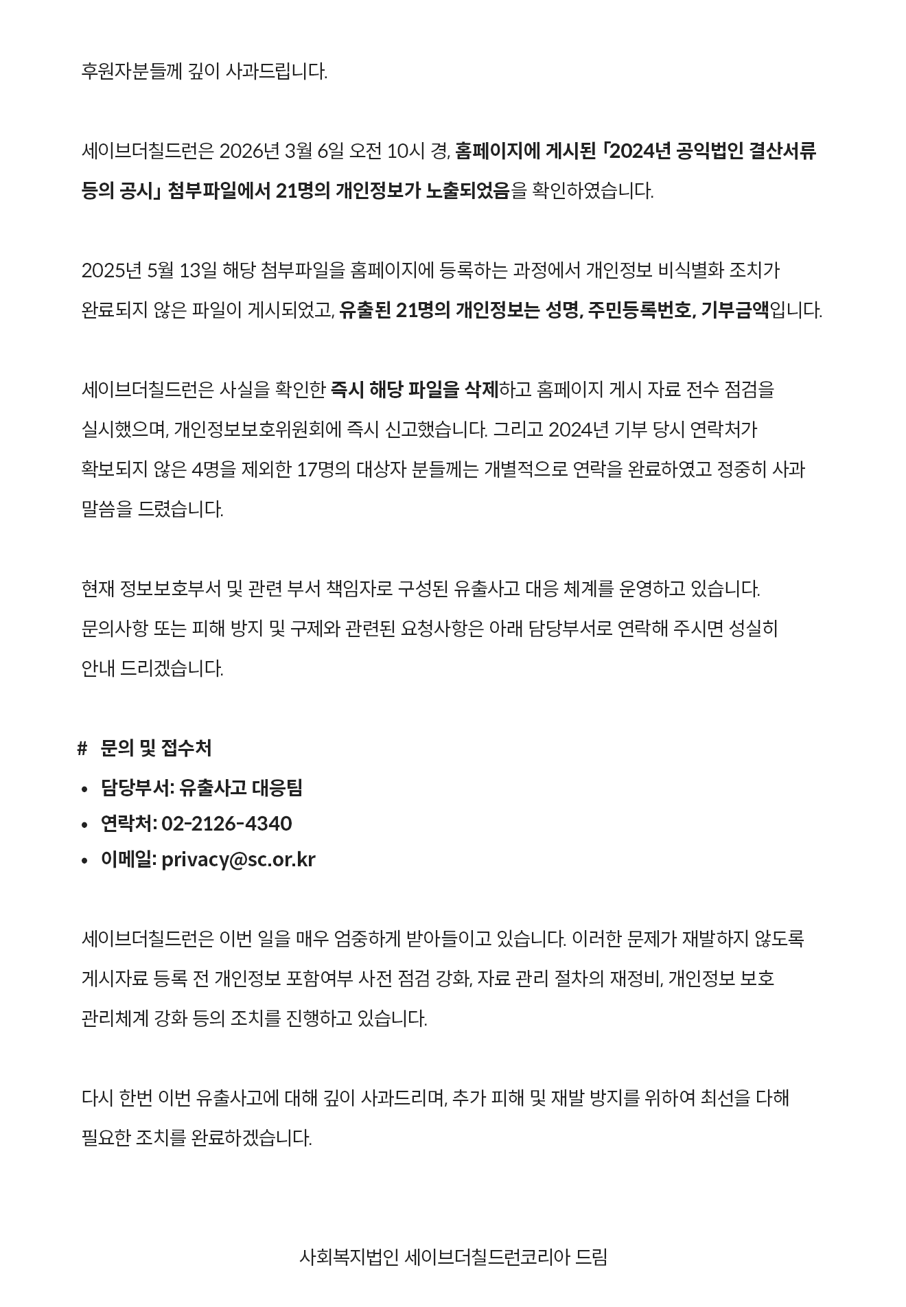 일부 후원자님들의 개인정보가 유출된 점에 대하여 깊이 사과드립니다.